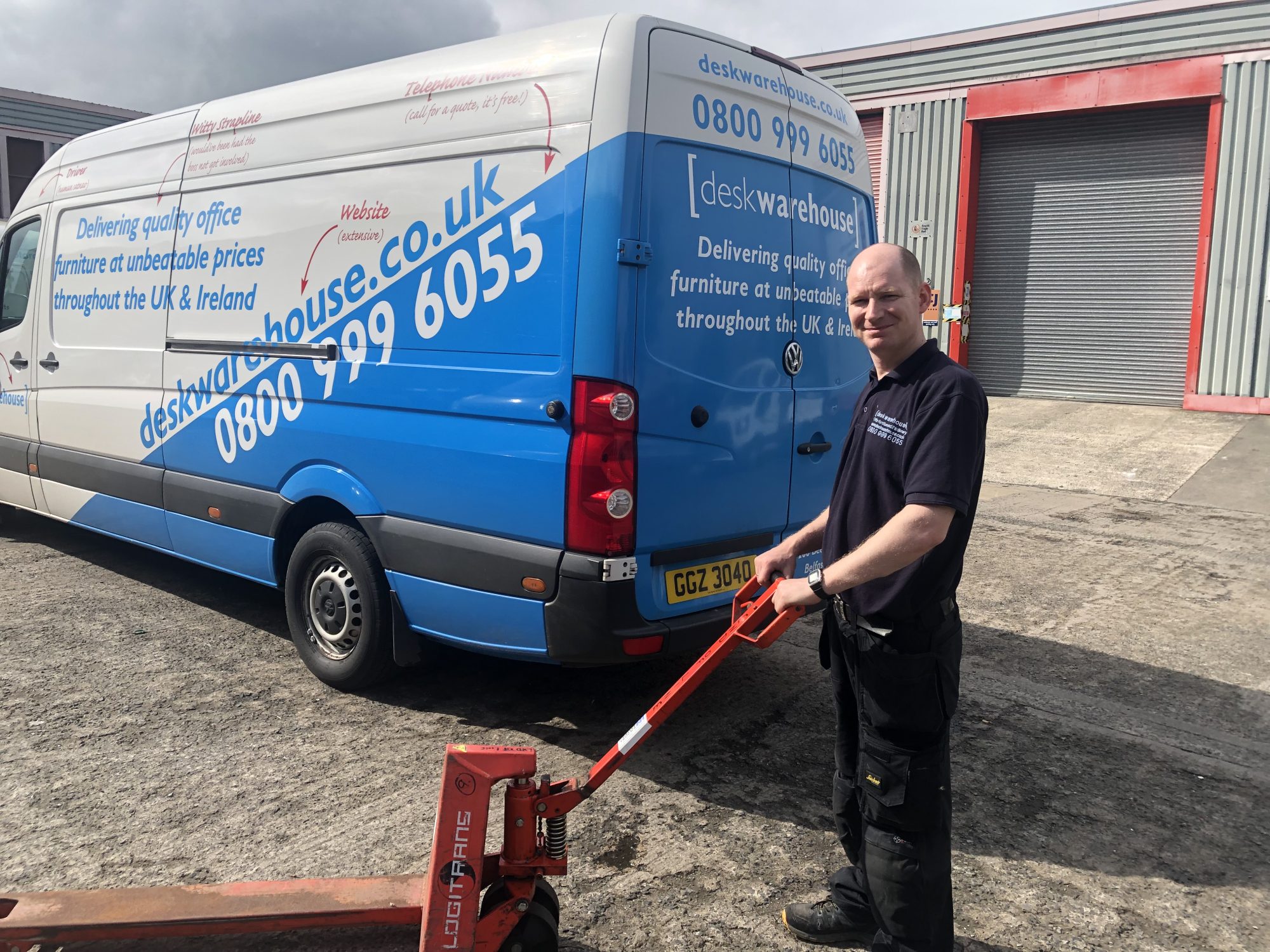 Desk warehouse collecting a repaired pallet truck. Well done for saving another pallet truck!!!!!!! Good to see the guys from desk warehouse . We are more than happy to service any brand of pallet truck. Feel free to give us a call and we can arrange for a service. Of course we have new trucks…
